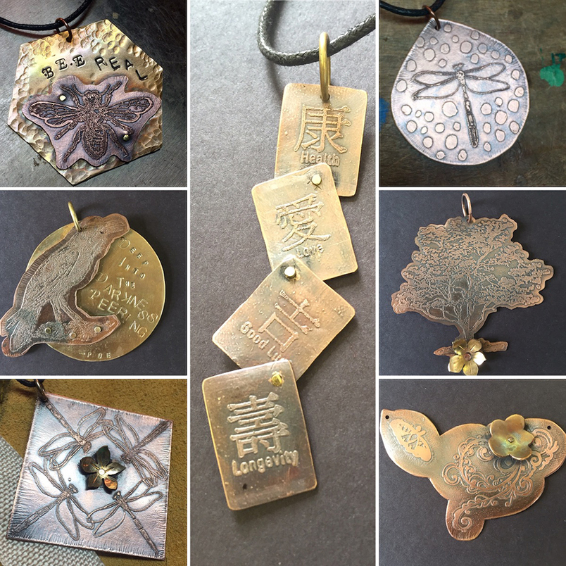 Etching is used to make raised designs in metal by using an acid to remove (or cut into) the unprotected surface of sheet metal. The metal can be used to create intaglio prints as well as jewelry. In this class, students will learn how to hone their skills with a jewelers saw, use resists and etch, and make cold connections to create a pendant or cuff bracelet in copper or brass.